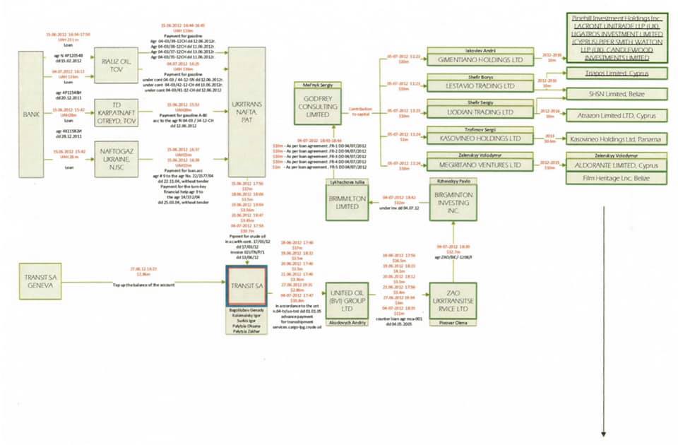 "Протягом декількох днів 38,2 млн доларів США були виведені з Укртранснафта на рахунки компанії Transit SA у Кіпрській філії Банку, що зареєстрована в Швейцарії на Ігоря Коломойського (32,5%), Геннадія Боголюбова (32,5%) та Ігоря Суркіса (25%)", – заявляє Ар'єв.